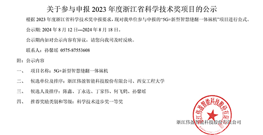 根據(jù) 2023 年度浙江省科學(xué)技術(shù)獎申報要求,現(xiàn)對我單位參與申報的“5G+新型智慧縫翻一體襪機”項目進行公式。